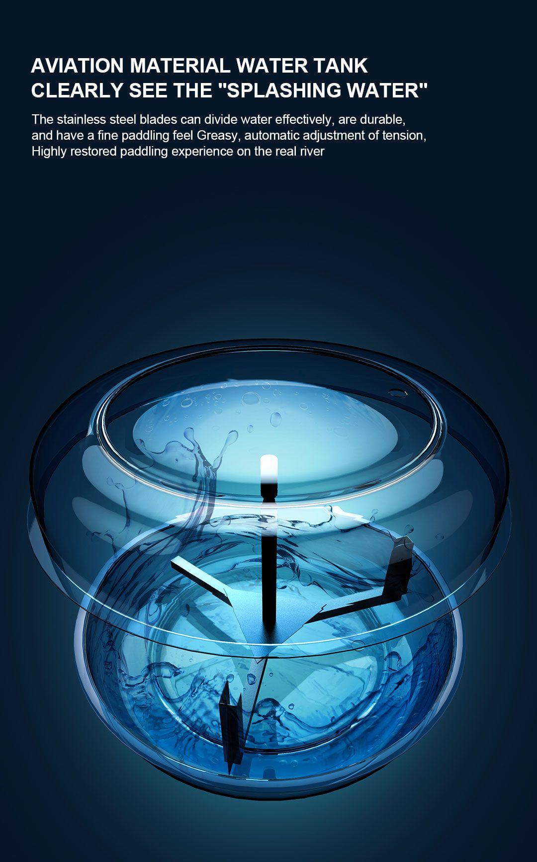 Romaskin med vannmotstand som er designet for å passe til enhver kroppstype og muskulatur, samtidig som den ikke belaster knærne. Horisontal bevegelse under trening, mens apparatet er i ro, vil ikke føre til skadelige trykk.